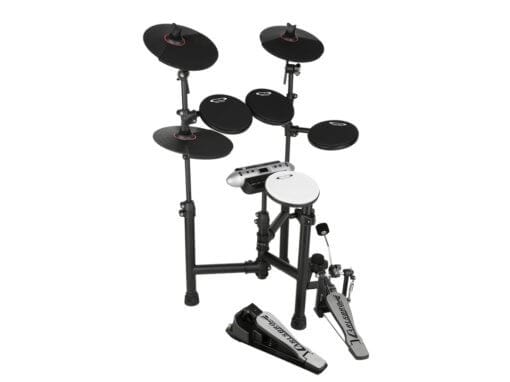 The Carlsbro CSD130 8-Piece Electronic Drum Kit features 10 user drum kits, 20 preset drum kits, 250 voices and reverb effect. Suitable for quiet practice via headphones or playing live at small venues through a powered amplifier. Ideal for the complete beginner through to more advanced players requiring a no-nonsense easy to use kit with incredible sensitivity on all pads. The pads “Real Feel” touch is extremely close to an acoustic kit, due to the specially selected Silica/rubber, chosen for all CDS models by professional drummers. Snare drum Pad is dual zone allowing open/closed rim-shots, plus dual Chokeable Cymbals. A high quality acoustic kick drum pedal is included in the package You can also play along using your smart phone, mp3 player or tablet via the aux jack.