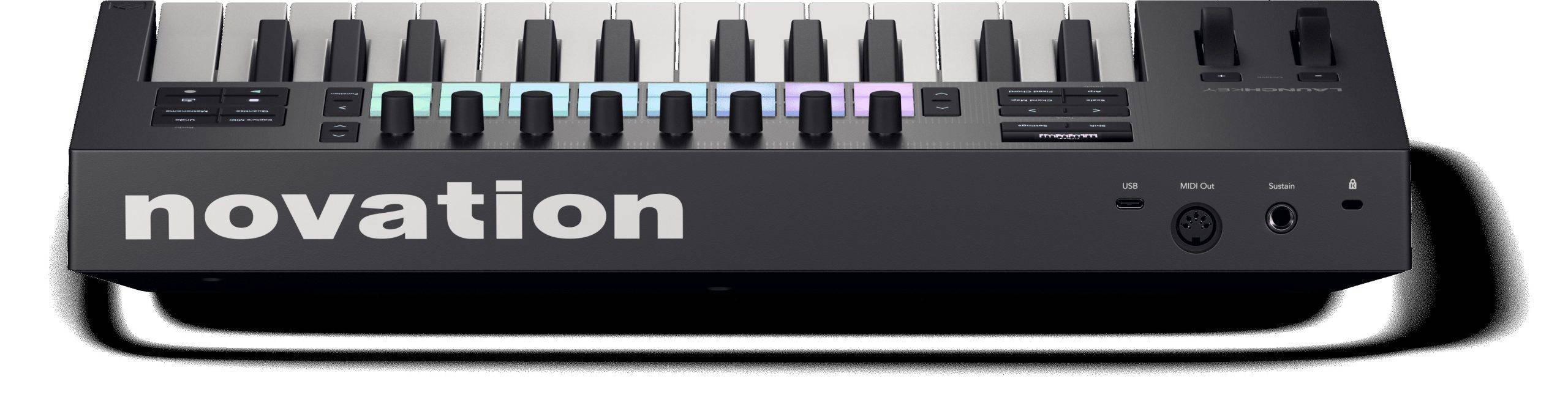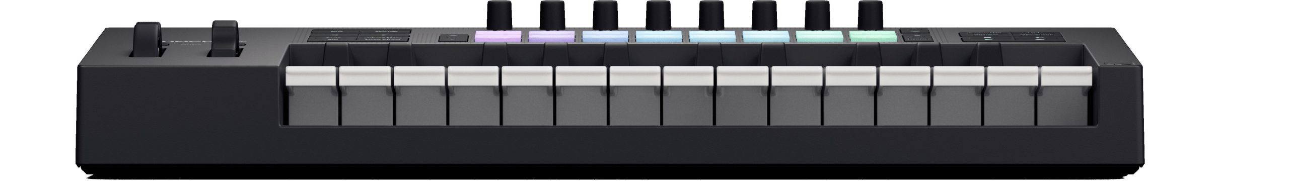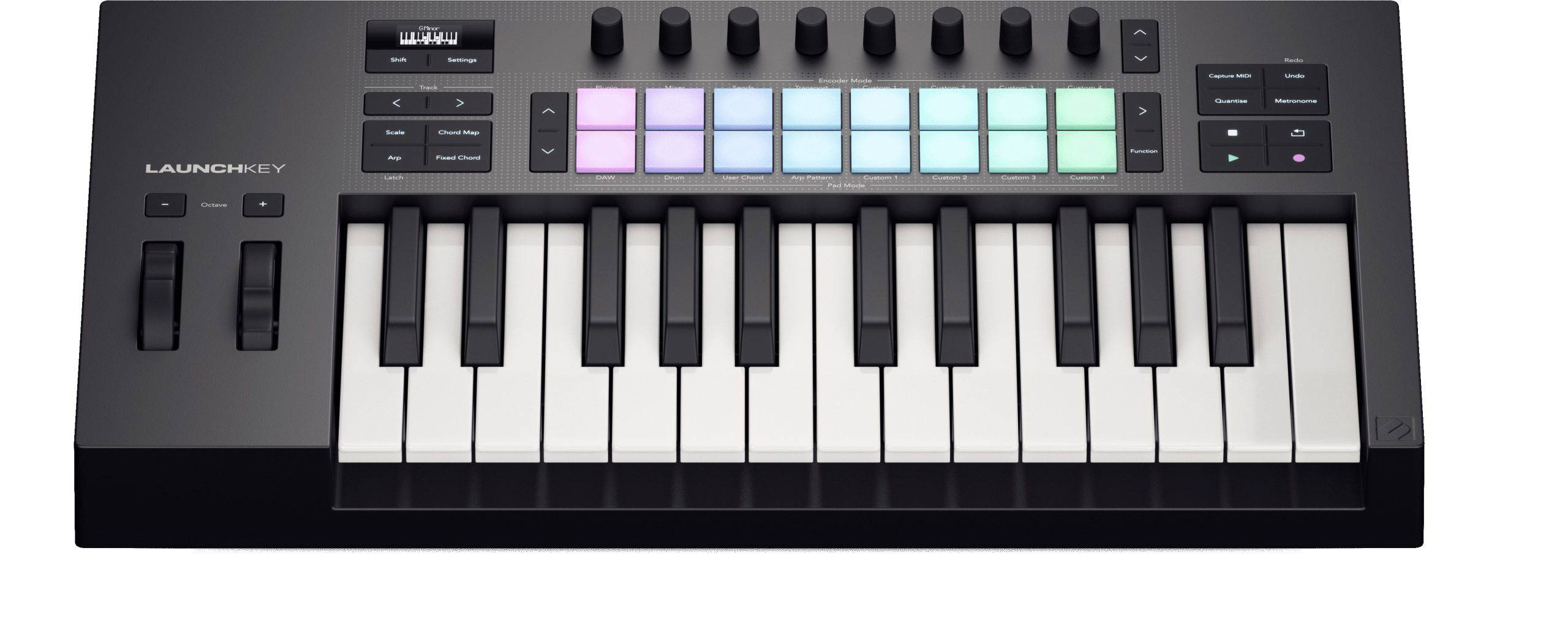 Launchkey 25 is a powerful DAW controller with two octaves of synth-style, full-size keys, eight continuous encoders and 16 velocity-sensitive pads for playing drums, instruments and launching clips. Creative Chord and Scale modes are built right in and work with the OLED display to make staying in key effortless.