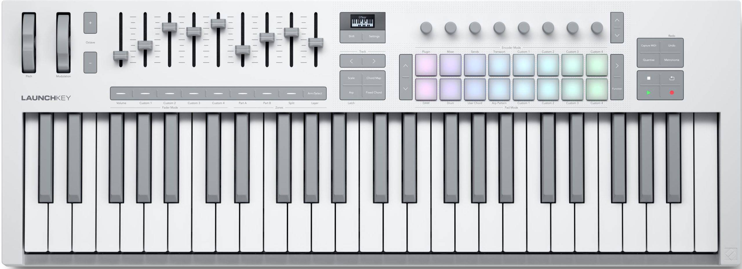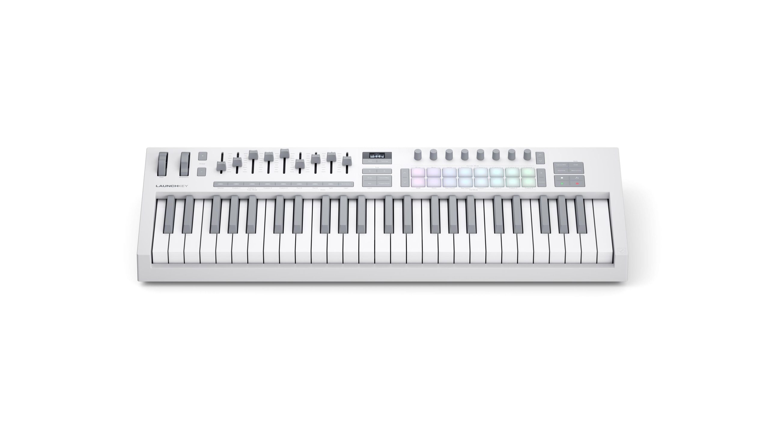 Launchkey 49 is a powerful DAW controller with four octaves of semi-weighted, waterfall-style keys, eight continuous encoders, nine faders and 16 velocity sensitive pads for playing drums and instruments and launching clips. Creative Chord and Scale modes are built right in and work with the OLED display to make staying in key effortless.