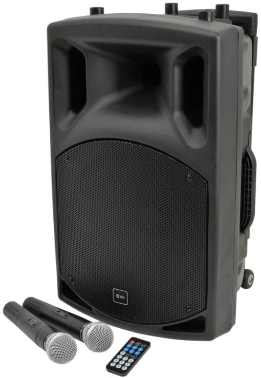 Complete portable PA unit in a QX12PA cabinet. Built-in amplifier operating from mains or internal rechargeable battery powering a main driver and compression driven horn unit. 2 x VHF handheld wireless microphones are included with the receiver built into the rear panel along with 2 further mic inputs, auxiliary line input and Bluetooth receiver. Internal audio source is provided by an integral USB/SD/FM media player. A moulded handle and pole mount are included and a retractable trolley handle and rear wheels provide easy portability.