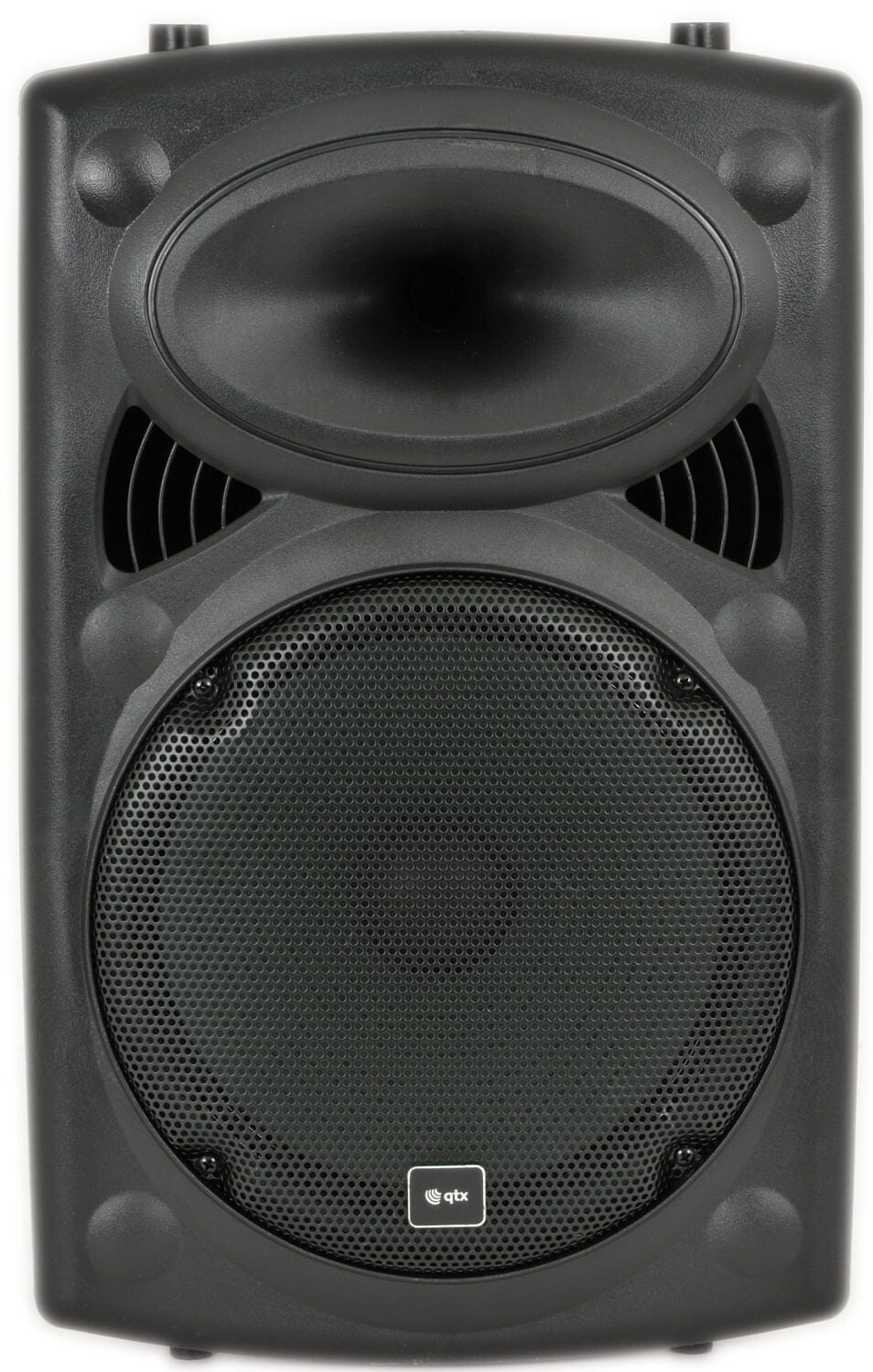 Self-contained portable PA units based on the QR12PA speaker cabinet. Built-in amplifier operating from mains or internal rechargeable battery powering a main driver and compression driven horn unit. A pair of VHF handheld wireless microphones are included with the receiver built into the mixer/amp section at the rear along with 2 further mic inputs, auxiliary line input and integral USB/SD media player. A moulded handle and pole mount are included and a retractable trolley handle and rear wheels provide easy portability.