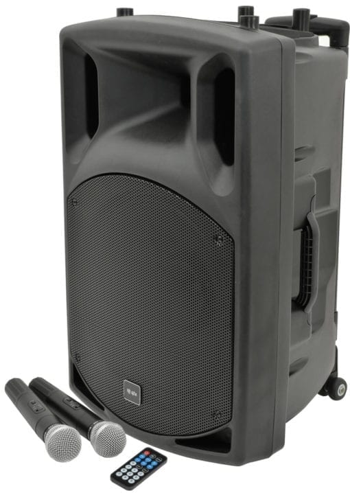 Complete portable PA unit in a QX15PA cabinet. Built-in amplifier operating from mains or internal rechargeable battery powering a main driver and compression driven horn unit. 2 x VHF handheld wireless microphones are included with the receiver built into the rear panel along with 2 further mic inputs, auxiliary line input and Bluetooth receiver. Internal audio source is provided by an integral USB/SD/FM media player. A moulded handle and pole mount are included and a retractable trolley handle and rear wheels provide easy portability.
